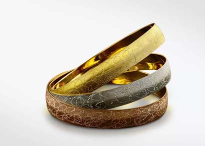 Gold is often alloyed with other metals to change its colour and strength. Eighteen karat gold is composed of 750 parts of pure gold per 1,000.